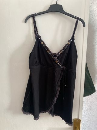 Top de tirantes con un diseño cruzado y detalles decorativos en el escote. - Ribete con pedrería y abalorios. - Bajo asimétrico con volante. - Cierre con cordón.