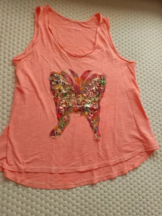 Camiseta de verano con un diseño llamativo. - Detalle de mariposa con lentejuelas. - Tirantes. - Bajo curvo. Mide 50 de sisa.