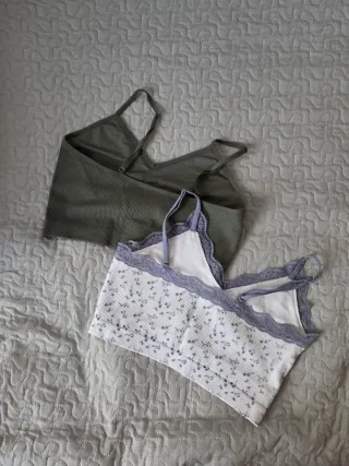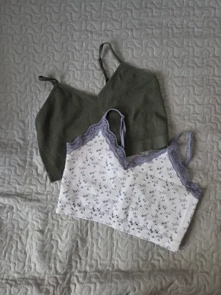 Conjunto de dos tops de tirantes de Primark. - Un top es de color verde liso. - El otro top es blanco con un estampado floral discreto. - Ambos tops tienen un detalle de encaje en el escote.