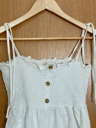 Precioso vestido blanco de estilo boho, ideal para el verano. Es de algodón ligero y tiene un diseño muy favorecedor. - Escote cuadrado con volantes. - Cierre de botones en el delantero. - Tirantes finos regulables. - Bajo con vuelo.
