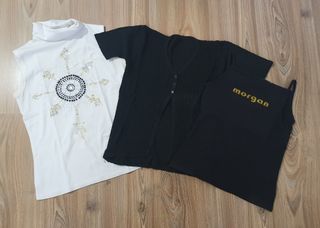 Conjunto de tres camisetas. - Camiseta blanca sin mangas con cuello alto y detalle de pedrería. - Camiseta negra de manga corta con botones. - Camiseta negra de tirantes con texto 'morgan'.