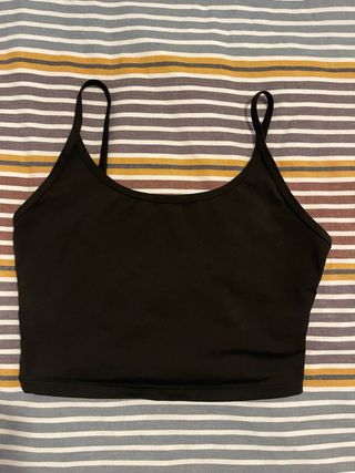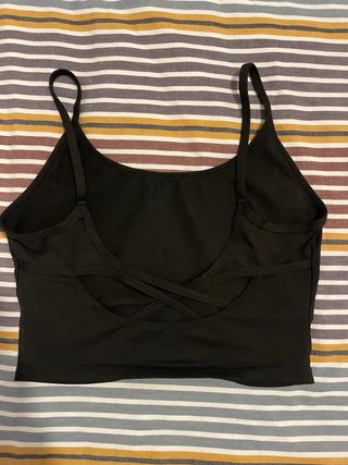 Camiseta negra con un diseño moderno y cómodo. - Tirantes finos que se cruzan en la espalda. - Cuello alto. - Tejido suave y elástico.