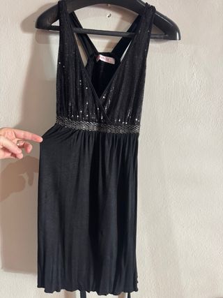Elegante camiseta de tirantes con detalles de lentejuelas y cinturón adornado. - Cuerpo superior con lentejuelas brillantes. - Cintura con detalle metálico. - Falda fluida de tejido suave.