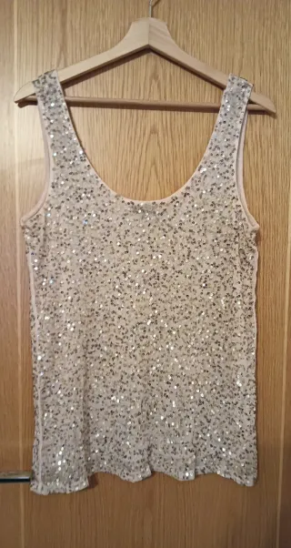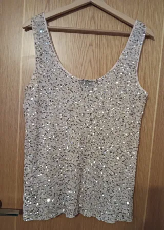 Camiseta de tirantes con un diseño brillante y llamativo. Nuevo con etiquetas - Detalle de lentejuelas por toda la prenda. - Corte sin mangas. - Cuello redondo.