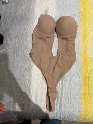Body sin tirantes de color beige, ideal para usar con escotes pronunciados y espaldas descubiertas - Diseño con copas. - Cierre inferior. - Tirantes transparentes ajustables