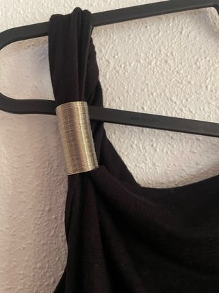 Camiseta negra con un diseño moderno y un detalle metálico en el hombro. - Tirante asimétrico. - Detalle metálico dorado en el tirante.