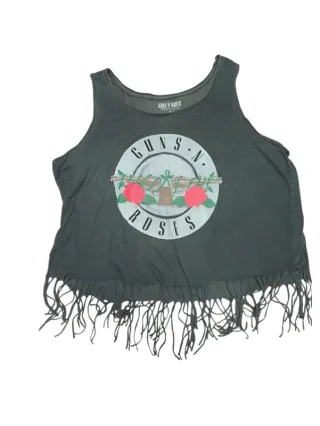 Camiseta de tirantes oficial Guns N’ Roses, color negro, con logo clásico y detalle de flecos en el bajo. Estilo rockero, cómoda, de algodón suave, perfecta para looks festivaleros, casual, o para fans de la banda. Talla XL
