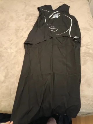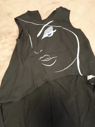 Camiseta sin mangas con un diseño artístico de rostro. Sin uso la tengo repetida más corta de alante más larga de atrás cierra con un botón atras. No hago envios - Diseño de rostro abstracto en blanco. - Corte asimétrico. - Tirantes anchos.