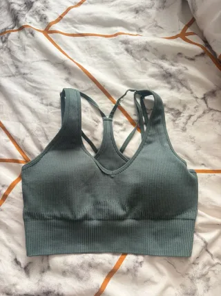 Top deportivo de tejido acanalado con tirantes cruzados en la espalda. - Diseño sin costuras. - Banda elástica en la parte inferior.