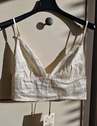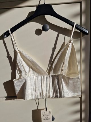 Precioso top de Zara en color beige, talla M. Es de raso y tiene un diseño elegante y sencillo. - Es de tirantes finos. - Tiene un corte cropped. - La tela tiene un ligero brillo. Tiene etiqueta y nunca fue utilizado!