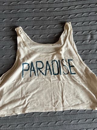 Preciosa camiseta de tirantes de color beige. Es de estilo cropped y tiene la palabra "Paradise" estampada en la parte delantera. - Es de algodón. - Tiene un diseño sencillo y elegante. - Ideal para el verano.