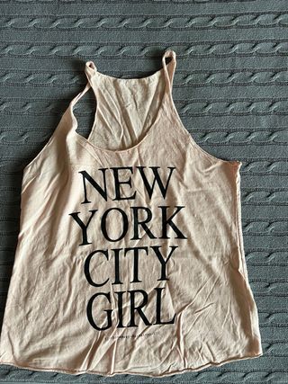 Preciosa camiseta de tirantes en color rosa palo. Tiene un diseño con la frase "New York City Girl" en negro. Es una prenda suave y cómoda, ideal para el verano. - Es de algodón. - Talla única (medidas de M)