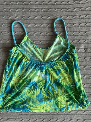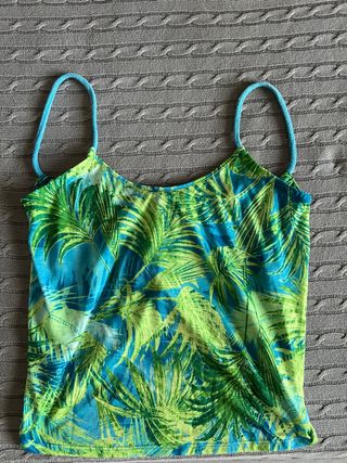 Preciosa camiseta de tirantes con un bonito estampado de hojas en tonos verdes y azules. Es de un tejido ligero y agradable al tacto. - Cierre trasero. - Tirantes finos.