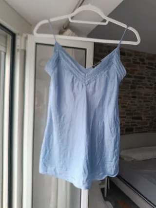 Precioso top lencero de Massimo Dutti en color azul. Ideal para combinar. - Diseño con tirantes finos. - Detalle de encaje en el escote. - Tejido ligero y suave.