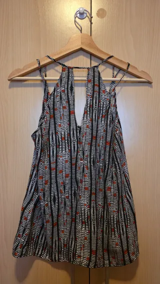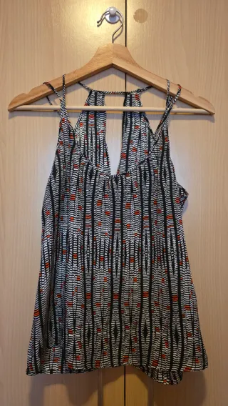 Top con tirantas finas y estampado llamativo. Diseño fresco y veraniego. - Tirantas finas. - Estampado geométrico con detalles en rojo y negro.