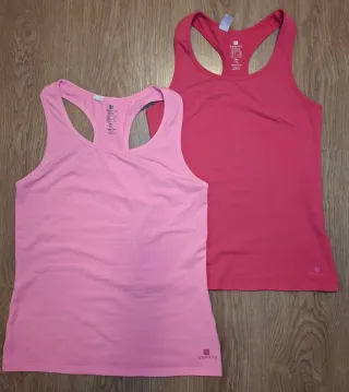Pack de dos camisetas deportivas Domyos, una en color rosa y otra en color rojo. - Diseño de tirantes. - Tejido transpirable. - Muy elásticas y cómodas.
