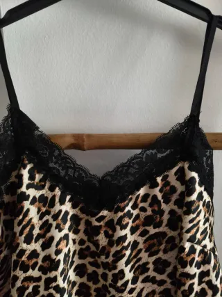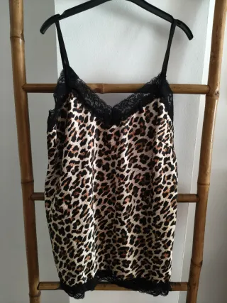 Bonita lencera con estampado de leopardo y detalles de encaje negro. - Tejido de satén suave. - Ribete de encaje en escote y bajo. - Tirantes finos ajustables.