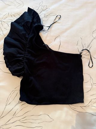 Camiseta de Zara con un diseño moderno y elegante. - Manga abullonada con volantes. - Corte asimétrico. - Tirantes finos.