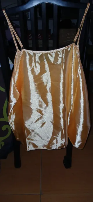 Blusa de satén dorada talla 2XL, con pinzas en el pecho, cuello en V y tiranta ancha. Medidas: Ancho 130cm Largo 64cm Nuevo a estrenar