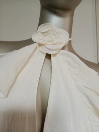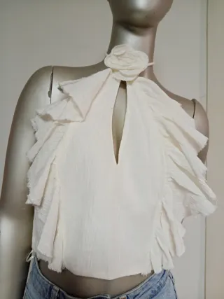 Elegante top crop blanco con un diseño único. - Detalle de flor en el cuello. - Volantes asimétricos. - Escote en pico. - Tirantes finos. - Nuevo sin Estrenar. - Talla S. - Cremallera en el Lateral.