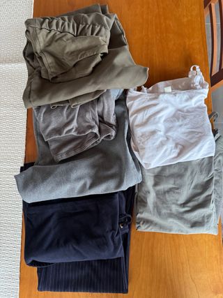 Conjunto de ropa cómoda para maternidad. -Pantalones de color gris - Pantalones de color verde. - Pantalones de color azul marino. - Camiseta de tirantes blanca. - Camiseta de tirantes gris.