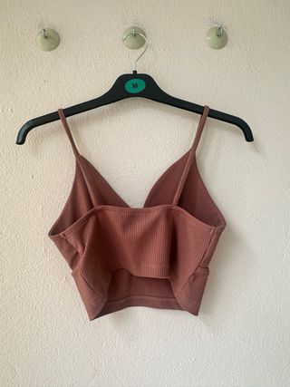 Top corto con tirantes finos y escote en pico. Su tejido acanalado le da un toque moderno. En buen estado