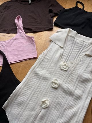 Conjunto de cinco tops variados para mujer. - Top marrón de manga corta. - Top blanco de punto - Top negro de tirantes . - Top rosa de tirantes. - Top negro estilo halter Todos en perfecto estado