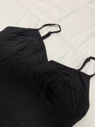 Top negro con diseño de tirantes finos y copas. - Tejido suave y elástico. - Diseño ajustado al cuerpo. - Detalle de costuras.