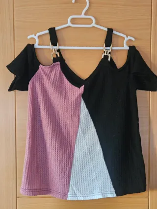 Camiseta de manga corta con un diseño moderno y original. - Diseño de bloques de color. - Tirantes con detalle de anillas doradas. - Mangas cortas con corte. - Tejido texturizado.