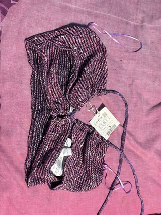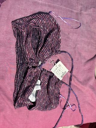 Top corto de tejido con un diseño vibrante, ideal para los días cálidos. - Tejido con hilos en tonos rosa y morado. - Diseño con tirantes finos. - Acabado fruncido en la parte inferior.