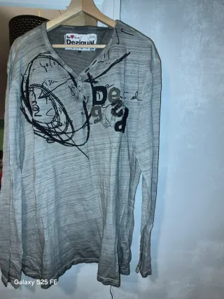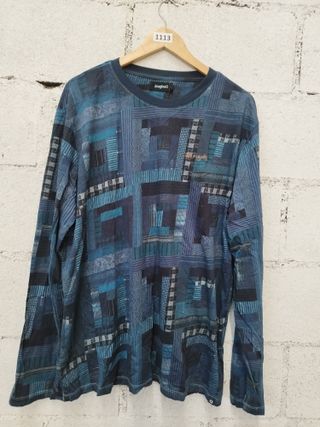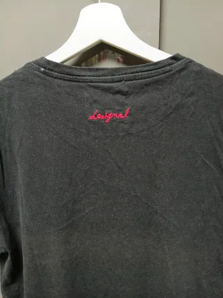 Camiseta de manga larga de la marca Desigual. - Diseño con cuello redondo y botones. - Tejido texturizado. - Estampado gráfico en el cuello. Es talla L, pero da bastante talla. Medidas en las fotos