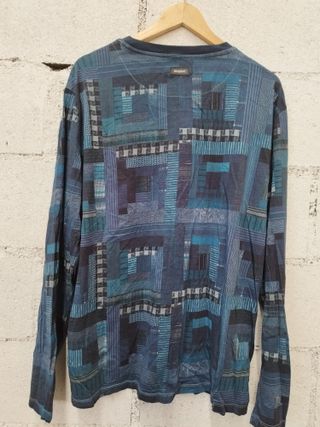 Camiseta de manga larga con un llamativo estampado geométrico. - Diseño patchwork en tonos azules y negros. - Cuello redondo. - Estampado integral.