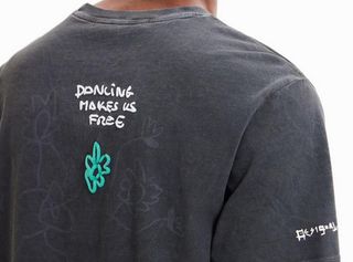 Camiseta de manga corta para hombre con fit regular y confeccionada en tejido de algodón con efecto lavado. Tiene una pequeña flor en un print de alta densidad y mensajes traseros. Cuello redondo, Print trasero de muñecos bailando, a tono Flor engomada delantera y trasera. Mensaje: "Dancing makes us free"
