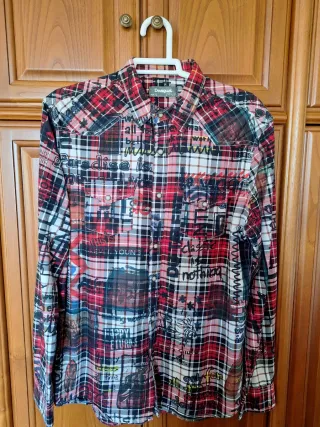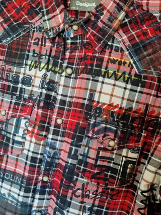 Camisa de chico de cuadros en tonos rojo y negro con ustampados muy chulos de Desigual. Puede usarse también como sobrecamisa con una camiseta debajo. Los botones son en realidad corchetes. Marca: Desigual Talla: L