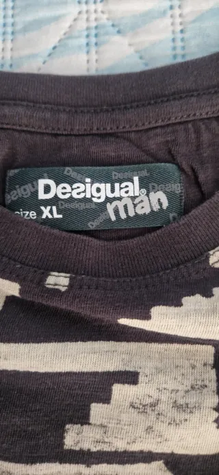 Camiseta de la marca Desigual, talla L, con un diseño patchwork y estampado. - Cuello tipo polo. - Manga corta. - Estampado abstracto y detalles en denim. Completamente nueva, nunca usada y con sus etiquetas.