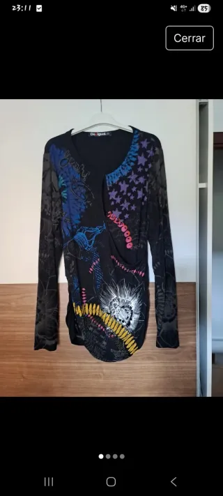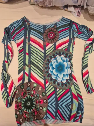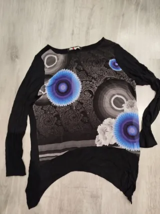 Blusa de la marca Desigual, manga larga con un diseño llamativo y colorido. - Estampado frontal con motivos circulares y detalles geométricos. - Mangas y espalda en color negro. - Cuello redondo. Más larga por la parte trasera. Usada muy pocas veces.