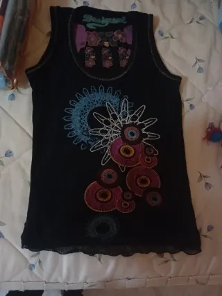 Camiseta sin mangas con un bonito diseño. Marca: Desigual Talla: S - Cuello con detalles. - Estampado floral en la parte delantera. Posibilidad de hacer lotes con más ropa de mi perfil.