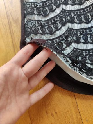 Blusa de gasa sintética sin mangas. Capas desiguales y sin remates Chaqueta con manga de algodón fino y espalda de tul bordado tipo blonda. Sin etiquetas.