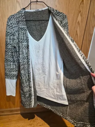 Chaqueta de punto o cárdigan. Conjunto que incluye una camiseta interior blanca integrada. Marca: Desigual. Estilo: Cárdigan de punto con patrón texturizado en tonos dorados, marrones, blancos, plateados y negros, con mangas blancas contrastantes. Diseño: "2 en 1", donde el cárdigan se combina con una camiseta blanca que presenta detalles decorativos o bordados circulares en el centro. Composición: Mezcla de materiales q proporcionan una textura de punto grueso pero ligero.