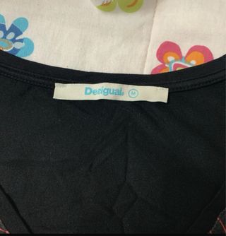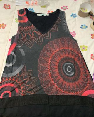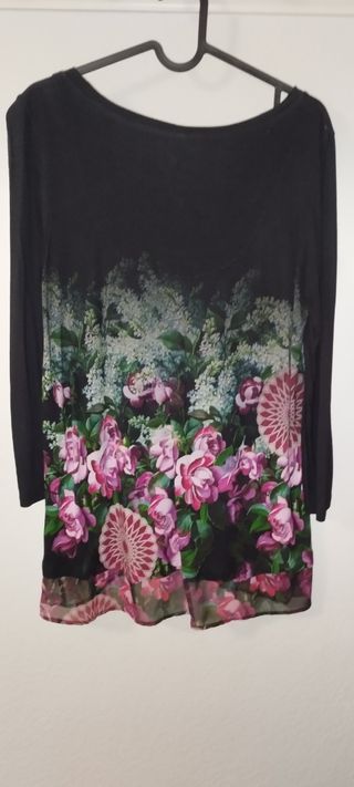 Camiseta blusa de la marca Desigual, no se ha puesto nunca aunque no tiene etiqueta. es tipo camiseta aunque va cubierta de tul hasta abajo. Talla L Pregunta por más prendas Desigual.