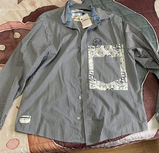 Camisa de la marca Desigual con un diseño de rayas. - Estampado de rayas verticales en azul marino y blanco. - Detalles de colores en el cuello y puños. - Bolsillo frontal con estampado gráfico.