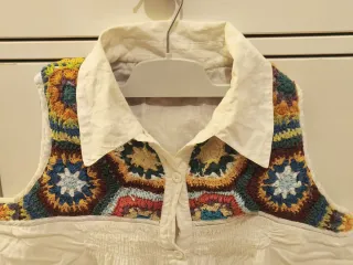 Camisa de manga corta con un diseño único. - Cuello camisero. Pequeño enganche en forro, es interior,no se ve. - Detalle de crochet multicolor en la pechera. - Puños fruncidos.
