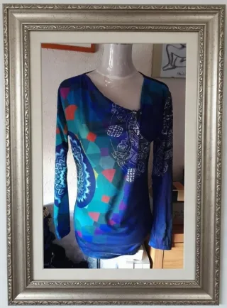 Preciosa camiseta de la marca Desigual, con un diseño único y colorido. Es de seda y tiene un corte favorecedor. - Manga larga - Cuello redondo - manga de murcielago - cinta a la cintuta que la ajusta a tu cuerpo