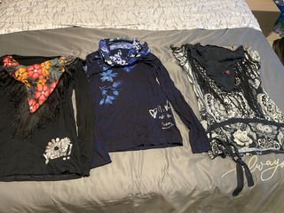 Conjunto de tres camisetas de la marca Desigual con cuello tipo pañuelo - Camiseta negra con estampado floral y flecos. - Camiseta azul marino con estampado de flores y cuello pañuelo. - Camiseta estampada en blanco y negro con flecos y lazo.