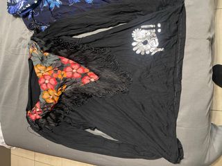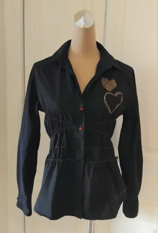 Camisa negra con motivos de fantasía tanto en la parte delantera como en la espalda. Entallada a la altura de la cintura para realizar la figura. En perfecto estado, a tener en cuenta faltan algunas de las lentejuelas doradas, apenas visible. Talla L pero sirve también para M (yo llevo S y la he usado como sobrecamisa) Medidas aproximadas: Sisa 47cm Largo 60cm
