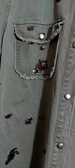 Camisa de manga larga con un diseño único y llamativo. - Detalle de lentejuelas repartidas por toda la prenda. - Bolsillos en la parte delantera. - Acabado deshilachado en puños y bajo.