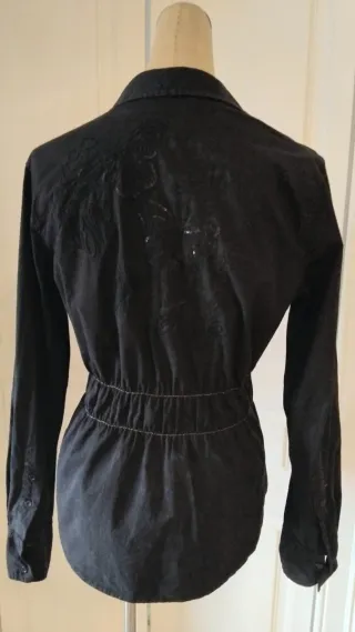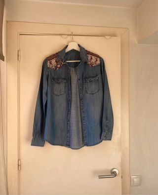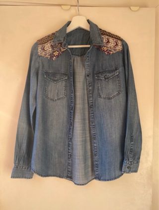 Vendo preciosa camisa tejana de la marca Desigual. Tejido con mucha caída y súper agradable y suave, 100% Lyocell. Cuenta con 2 bolsillos en la parte frontal y tiene muy bonito detalle de canesú de aplique bordado con lentejuelas en la espalda. Está en perfectas condiciones, sin ningún tipo de desgaste o desperfecto. Usado en 2 ocasiones. Precio en tienda 90€.