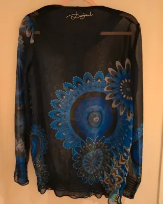 Preciosa camiseta de la marca Desigual, en color azul. Esta prenda apenas se ha usado, está en muy buen estado. Medidas. Pecho 48cm largo 68cm. Cintura 46cm - Talla: (Añadir talla) - Manga larga - Estampado floral con detalles brillantes