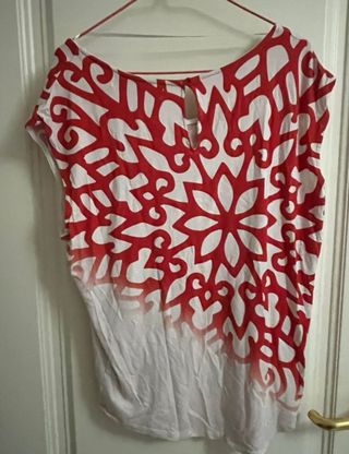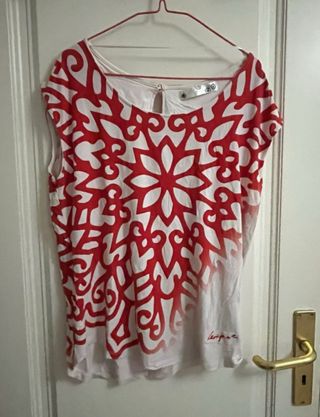 Preciosa camiseta de la marca Desigual. Es de color rojo con un diseño multicolor. En muy buen estado. Se ha usado poco. - Talla: vendría a ser una M - Cuello redondo con abertura - Manga sisa - Estampado floral con detalles dorados