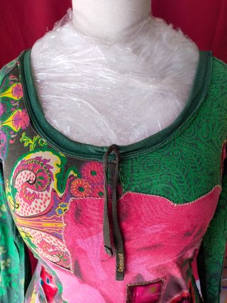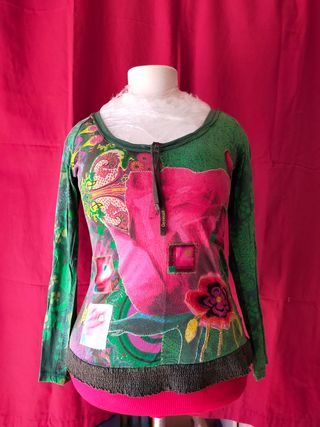 Camiseta de manga larga estampada en tonos verdes, marca Desigual. Cuello redondo, tiras con el logo de la marca impreso con las que se puede fruncir el escote si se desea. El frontal de la camiseta se compone de estampados en tonos cálidos, aplicaciones de tejido sedoso y una bonita flor bordada. Todo el bajo del cuerpo está drapeado, la parte delantera del drapeado es verde y la trasera roja. Logo bordado en centro espalda. Incluye estampado en el interior de la espalda.